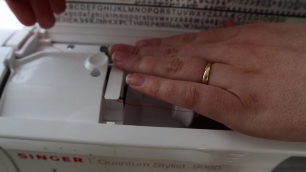 While still pinching the thread with your right hand, take your left hand (which should still be holding onto the thread) and press down on the thread feeder.