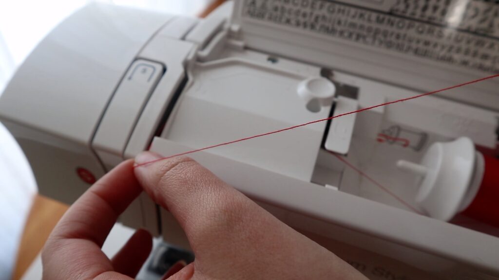 Grabbing the thread, pull it out and over towards the left side of your machine.